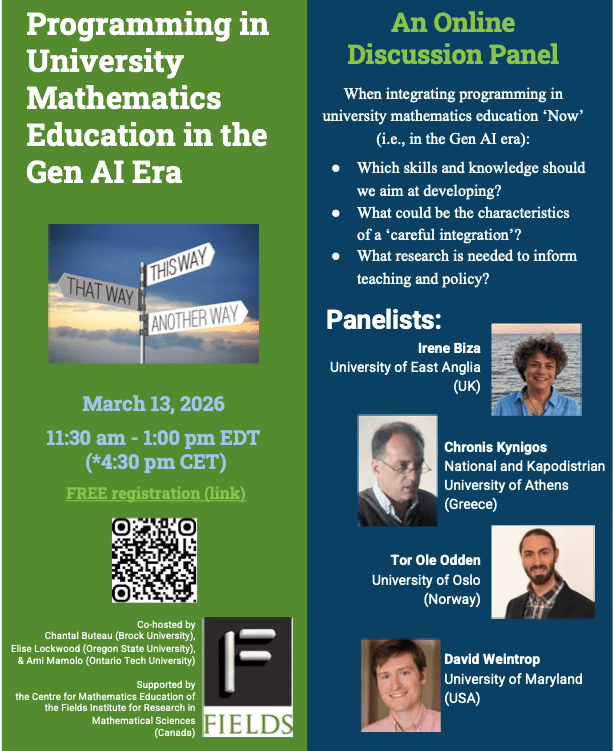 This series was co-hosted by Chantal Buteau (Brock University) and George Gadanidis (Western University) at the Fields Institute for Research in Mathematical Sciences (Toronto, ON). For more details, visit the event webpage.